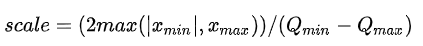对权值和数据的量化可以归结为寻找scale的过程,由于int8为有符号数,要保证正负数值表示范围的对称性,因此对所有数据首先进行取绝对值的操作,使待量化数据的范围变换为,再来确定scale,其scale正确的计算公式为: