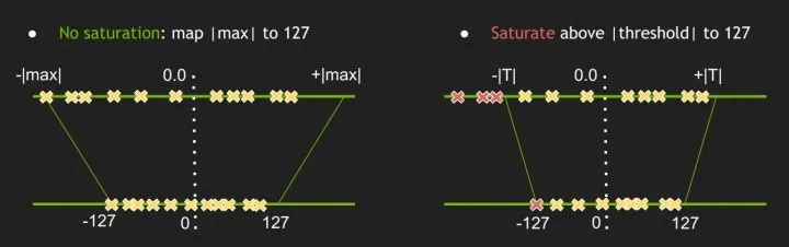 进行饱和式截断,即超过范围的数据饱和到边界值,然后进行第一条公式所示量化计算即可。