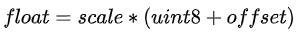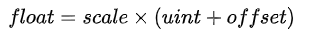 其中,scale是float32浮点数,uint为unsigned INT8定点数,offset是int32定点数。其表示的数据范围为