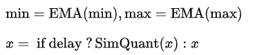 - FakeQuantWithMinMax(in:x, min, max, delay; out: x):控制流delay,训练模型中插入伪量化节点fake quant来模拟量化引入的误差,并用指数移动平均算法更新min和max: