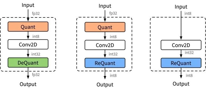 端侧量化推理的结构方式主要由3种,分别是下图的(a) Fp32输入Fp32输出、(b) Fp32输入int8输出、(c) int8输入int32输出。