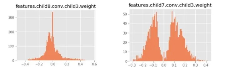 前面呢,曾经提到一般而言,权重数据是对称,为了可以进一步减少数据的计算,较少额外的存储数据,因此推荐使用对称的量化算法。但是在对mobieNetV2,mobileNetV3的实际测试开发的过程中,发现数据大部分是有偏的,例如mobileNetV2中: