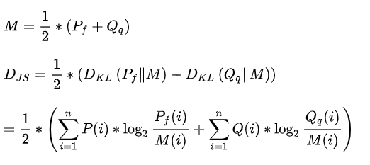 - Jensen-Shannon Divergence(JS散度):首先生成一个新的分布M,为与的均值,JS Divergence为相对M的KL Divergence与相对M的KL Divergence的均值, 计算方式如下: