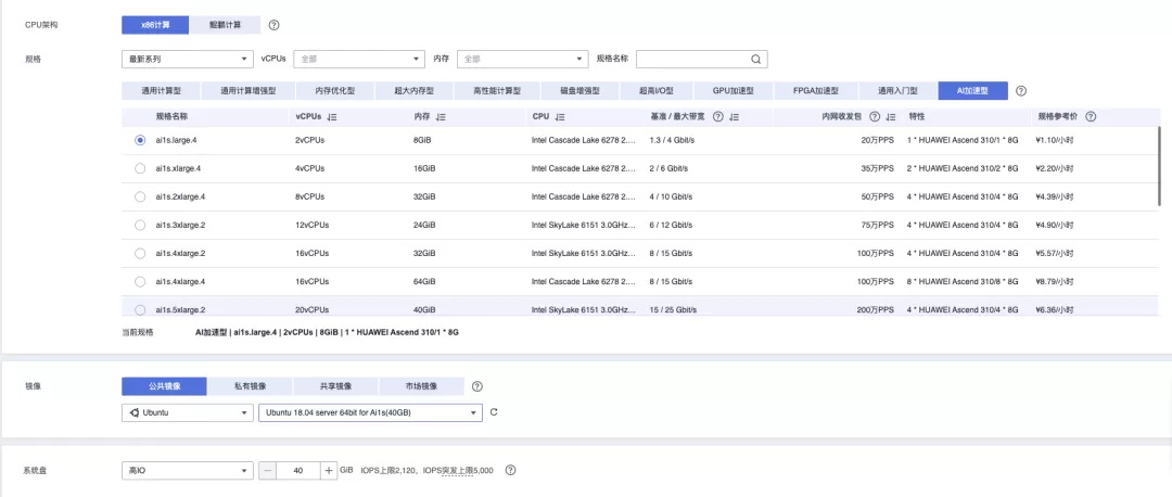 - 系统镜像选择Ubuntu 18.04 server 64bit for Ai1s