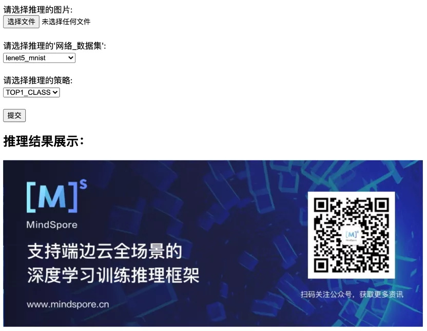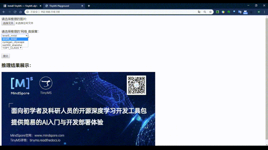 针对小白用户,TinyMS还提供了WEB UI项目容器化快速部署,用户无需coding即可在web界面轻松体验图像识别,在浏览器页面上传待推理的图片即可返回模型推理结果,目前支持LeNet5数字识别、CycleGan风格迁移和SSD300目标检测等多种AI任务。