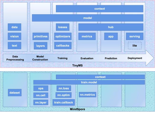 昇思MindSpore从开源以来,虽然处于快速迭代中,但社区秉承业界优秀开源项目的传统,在API后向兼容性上,引入了一系列机制,确保核心API的稳定性,让用户用的更安心、更放心。一些非核心的API接口因为业务场景需求,会按照API管理规则进行调整。由于TinyMS高度继承和扩展了MindSpore原生API(如下图),很好地验证MindSpore每个版本的接口兼容性,开发者可以快速客观的获悉版本迭代的易用性信息。