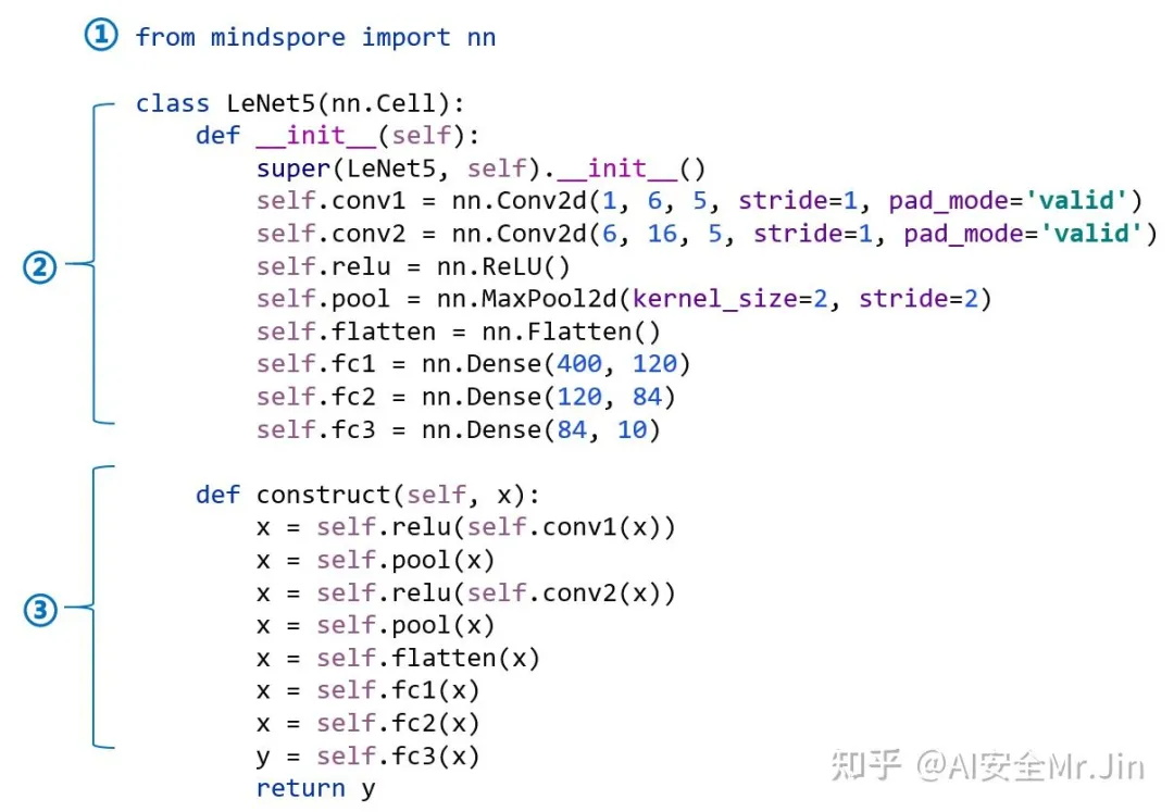 如上图所示,我们用到的“砖块”都是mindspore.nn模块提供的。注意:这里用到了Python的类(class),由②和③两部分组成。我们这里定义的类是class LeNet5,它由初始化函数 __init__(self) 和构造函数construct(self, x)组成。初始化函数定义了我们构造模型所需要用到的算子,比如conv算子、relu算子、flatten算子等等,这些算子都是从mindspore.nn获取的;构造函数就是把我们在初始化函数中导入的算子按顺序排放,构成我们最终的模型。construct()函数的输入