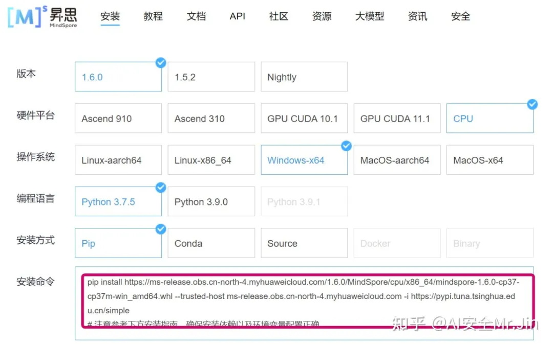 **方式一:**进入MindSpore官网,根据自己的设备和Python版本选择安装命令。比如我的Python版本是3.7.5,我的设备是笔记本(CPU),那么我就复制下图红框中的命令进行安装: