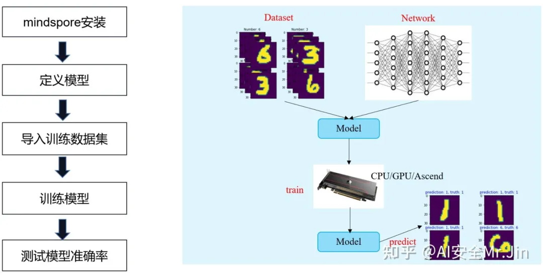 首先我们要先了解深度学习的概念和AI计算框架的角色(_https://zhuanlan.zhihu.com/p/463019160_),本篇文章将演示怎么利用MindSpore来训练一个AI模型。和上一章的场景一致,我们要训练的模型是用来对手写数字图片进行分类的LeNet5模型,请参考(_http://yann.lecun.com/exdb/lenet/_)。