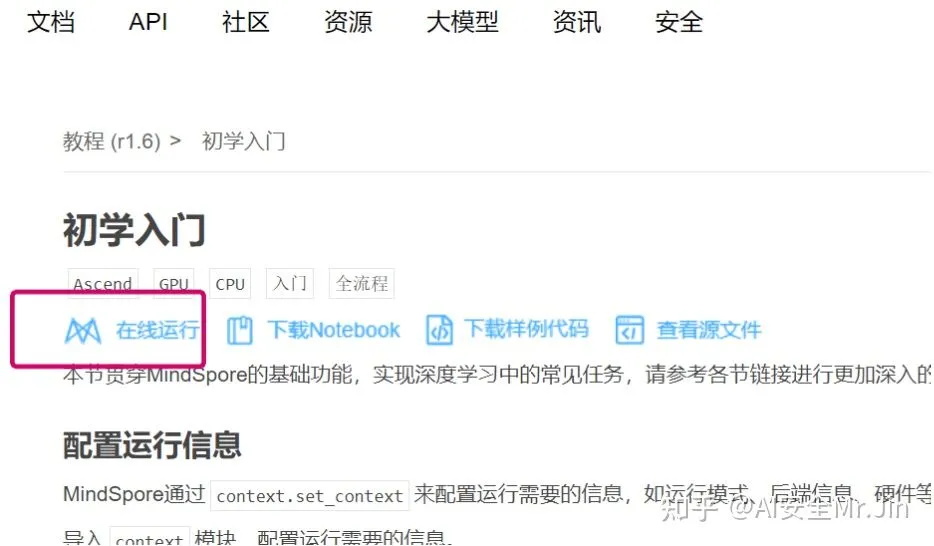 祝贺你耐心看完了MindSpore训练模型的完整过程,如果你想动手操作一遍,但是又没有现成的环境,那么你可以使用官网提供的**“在线运行”**来体验一番: