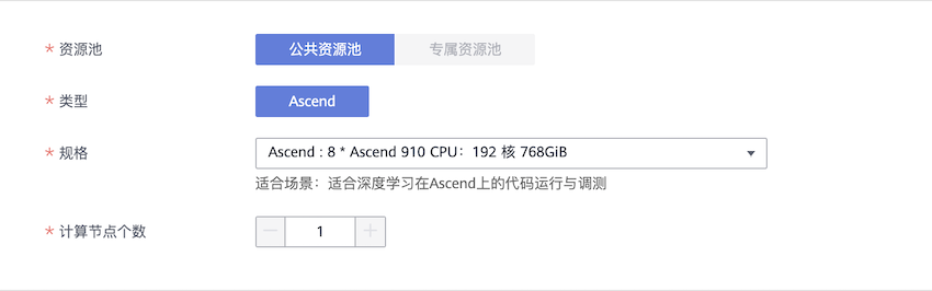 算法来源:选择常用框架,然后AI引擎选择Ascend-Powered-Engine和所需的MindSpore版本(本示例图片为Mindspore-0.5-python3.7-aarch64,请注意使用与所选版本对应的脚本)。代码目录选择预先在OBS桶中创建代码目录,启动文件选择代码目录下的启动脚本。数据来源选择数据存储位置,并填入OBS中CIFAR-10数据集的位置。运行参数:数据存储位置和训练输出位置分别对应运行参数data_url和train_url,选择增加运行参数可以向脚本中其他参数传值,如epoch_size。资源池选择公共资源池 > Ascend。资源池 > 规格选择Ascend: 1 * Ascend 910 CPU:24 核 96GiB或Ascend: 8 * Ascend 910 CPU:192 核 768GiB,分别表示单机单卡和单机8卡规格。