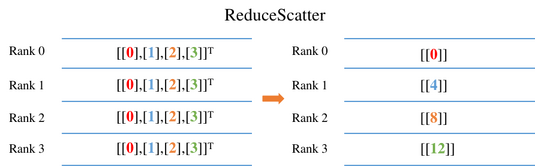 示例代码如下:我们根据rank号(每张卡所属通信编号)初始化每个进程中ReduceScatter算子输入的数值,例如卡0,我们申请了一个4x1大小,数值为0的输入。然后调用ReduceScatter算子,在通信域为0-1-2-3的卡(所有卡的通信范围即nccl_world_group)中进行通信,并且打印输出结果。