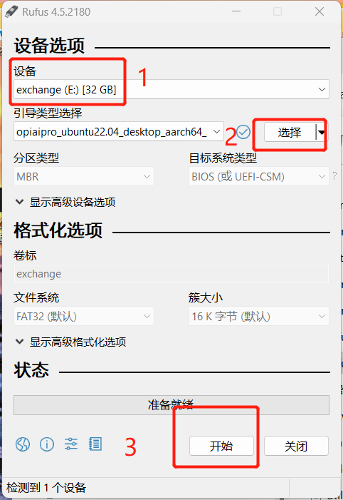 SD卡插入读卡器,读卡器插入电脑、选择镜像与SD卡,点击“开始”。
