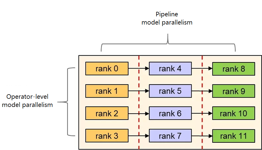 Using operator-level and pipeline model parallelism, MindSpore deploys models with a large number of inference parameters to multiple cards in a distributed manner.