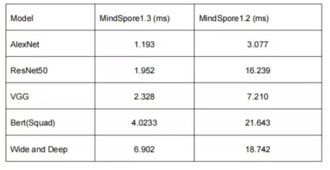 We tested how some typical networks run in ModelZoo using MindSpore 1.2 and MindSpore 1.3 and collected statistics on the average execution time of the inference requests. The results show up to an 8-fold inference performance boost.