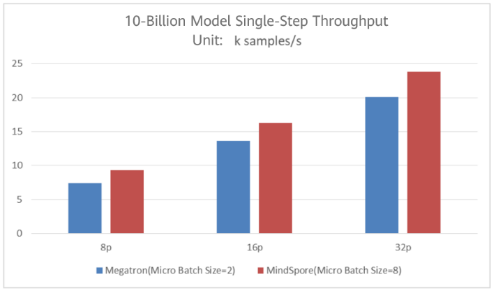 · The maximum throughput of 8P Megatron is 7,400 samples/s, and that of MindSpore is 9,300 samples/s, a 25% increase by Megatron.