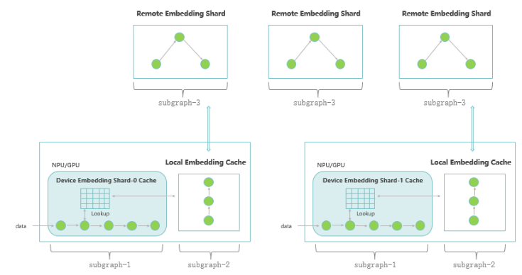 (2) Distributed embedding cache: uses multi-level embedding cache and computing pipeline design to store large-scale feature vectors and achieve high performance in training.