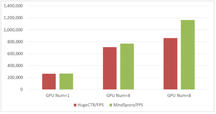 The throughput of MindSpore on a single server with eight GPUs is 35% higher than that of HugeCTR.