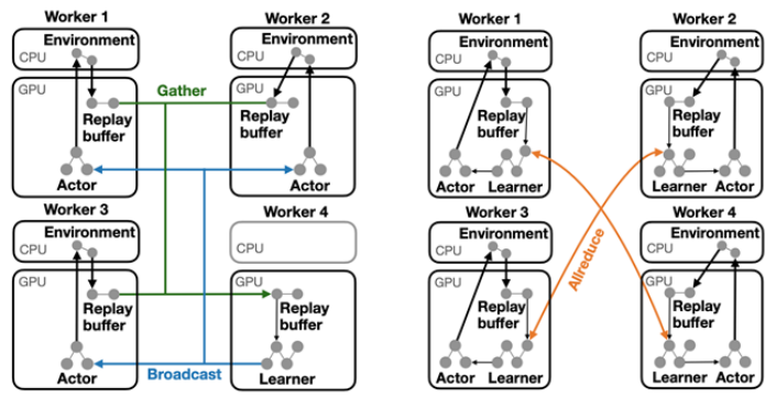 The distributed reinforcement learning framework mainly uses Python functions to implement algorithms. Despite intuitive programming APIs, it is challenging to implement multi-machine parallelism and heterogeneous acceleration.