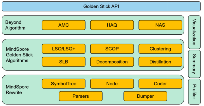 MindSpore Golden Stick is an algorithm set for model compression. Developed by Huawei Noah's Ark Lab and MindSpore team, it provides various model compression algorithms, such as pruning and quantization, to reduce the number of model parameters and lower the threshold for deploying models on devices.