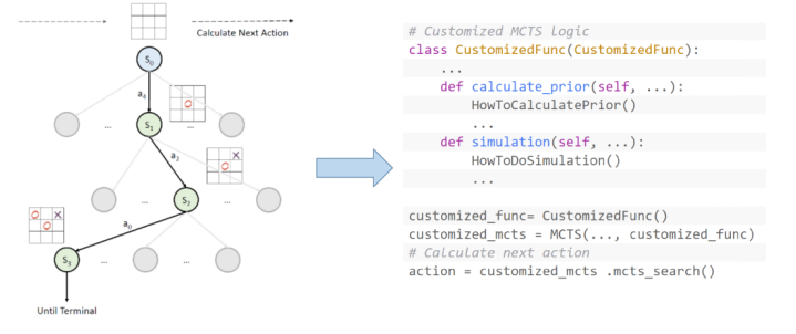 MindSpore Reinforcement v0.5.0 provides a common extensible MCTS algorithm. Developers can either use Python to directly invoke the embedded MCTS algorithm for the reinforcement learning algorithm, or customize logic through extension. The framework automatically compiles the algorithm into a computation graph for efficient execution.