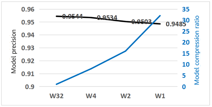 We have performed a simple experiment on the SLB algorithm and the result is shown as follows. In the current task, the model size is reduced to 1/8 of the full-precision model after 4-bit weight quantization without compromising the top 1 accuracy (the precision loss of 1-bit weight quantization is within 0.6%). In this case, the compression effect is increased by 32 times.