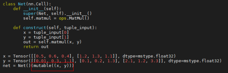 To solve the problem, the mutable API is added to MindSpore 1.8 for setting the constant input of the network to variable. That is, the input is regarded as a variable like a tensor. In this way, the gradient can be calculated and the network can be prevented from being compiled repeatedly. The API is user-friendly: use the mutable interface to encapsulate the network input when passing parameters, as shown in the following figure.