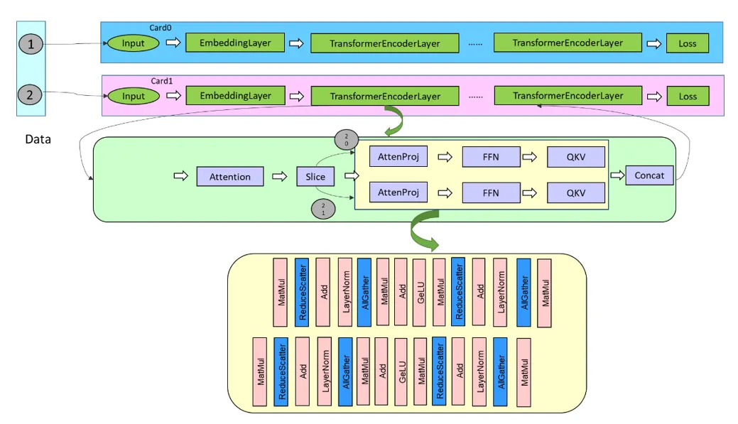 The figure above illustrates the basic idea of fine-grained multi-copy splitting and overlapping in a sequential parallelism scenario. Specifically, two copies are generated after the splitting, achieving over 50% communication overlapping in forward propagation. In backward propagation, by combining the overlapping between branch-based gradient computation and TP communication, 90% communication overlapping can be achieved. Currently, fine-grained multi-copy parallelism is only implemented in the LLaMA network of MindSpore Transformers, and requires manual restructuring of the model structure into multiple copies. In later versions, MindSpore will integrate the logic of automatic copy splitting, to achieve finer-grained multi-copy parallelism for easier use.