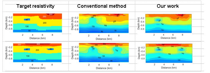 (1) Basic MT inversion: The horizontal length of the inversion area is 10 km, and the depth is 1 km. In the figure below, the target resistivity distribution (first column), conventional MT inversion (second column), and MT intelligent inversion (third column) are displayed, demonstrating that the precision of MT intelligent inversion is significantly improved compared with that of conventional inversion (the residuals of the former are 0.0056 and 0.0054, and the residuals of the latter are 0.023 and 0.024). As seen in figure 2, the overall performance of the MT intelligent inversion method also surpasses that of the conventional inversion method (the convergence iterations of the former are 4 and 4, while the convergence iterations of the latter are 6 and 4).