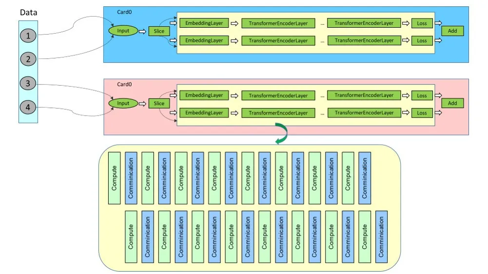 In an earlier version of MindSpore, a network is split from data. As shown in the following figure, in a single card, the slice operator is used to split the batch dimension to generate multiple branches. The computation and communication of these branches have no dependencies on each other, and have concurrency potential. By suing the execution sequence scheduling algorithm, multiple branches of computation and communication can be controlled to proceed concurrently.