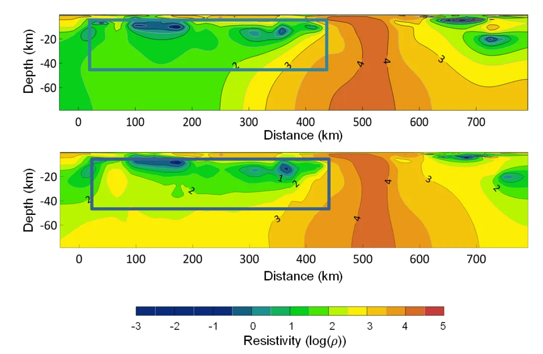Figure 3 MT inversion in Southern Africa (above: conventional inversion; below: our work)