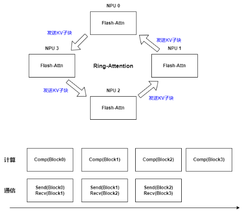 昇思MindSpore2.4版本支持Ring Attention算法,如下图所示,利用 Attention 的分块计算性质,当序列并行度为 N 时,将 Q,K,V 分别切分为 N 个子块,每张卡分别调用 FlashAttention 算子来计算本地{Qi, Ki, Vi}子块的 Attention 结果。由于每张卡只需要计算切分后 QKV 子块的 Attention,其内存占用大幅降低。RingAttention 在做 FA 计算的同时采用环形通信向相邻卡收集和发送子块,实现计算与通信的最大化掩盖,保障了长序列并行的整体性能。