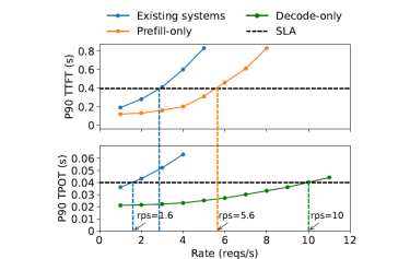 由于大模型推理在Prefill和Decoding阶段在资源需求和执行时间上有差异,Prefill是计算密集型任务,而Decodeing是存储密集型任务,PD混部会面临资源竞争、缓存压力、延迟增加和负载不均衡等问题。如下图所示,Prefill-only吞吐量有5.6tps,Decode-only有10tps,而混部只有1.6tps。