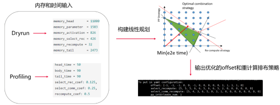 为解决上述问题,昇思MindSpore2.4版本提供了SAPP(Symbolic Automatic Parallel Planner)自动负载均衡工具。如上图所示,输入模型的内存和时间信息,以及部分流水线并行性能相关的超参(如重计算对性能的影响),工具将自行构建线性规划问题,通过全局求解的方式,为大模型自动生成流水线并行中的stage-layer配比,调整各layer重计算策略,自动优化集群算力和内存利用率,降低空等时间,实现Pipeline并行分钟级策略寻优,大幅度降低性能调优成本,显著提升端到端训练性能。