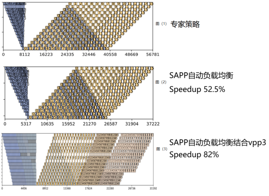 以LLAMA2-175B模型为例,流水并行数设置为16,如上图所示,图(1)展示专家策略的流水排布较为工整,但是含有较多空白的计算空隙(bubble);图(2)展示相同模型使用SAPP的结果,计算空隙大幅度减少,端到端性能相比于专家策略提升52.5%;图(3)是开启流水交织并行(Pipeline Interleave)时候的SAPP结果,设置vpp=3,从图中可以看出计算被切得更细,且负载均衡调整更加精细化,端到端性能相比于专家策略提升82%。