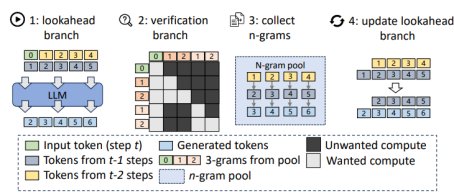 与自回归解码不同,并行解码每步可以同时解码多个token,然后并行验证它们,从而加速推理性能。前瞻解码(Lookahead Decoding)是一种基于Jacobi迭代的并行解码算法,无需微调,且不依赖小模型或离线数据集。前瞻解码通过Prompt及输出结果生成N-Grams,根据N-Grams生成草稿token,执行并行解码进行校验,减少推理步数以获得加速效果。