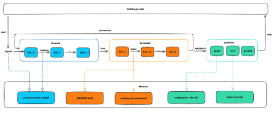 To solve the problem that abnormal updates in the LLM training service may cause drastic status changes and difficult fault locating during model training, the msprobe tool is added to monitor the training status in the MindSpore dynamic graph scenario. Activation values, weight gradients, optimizer status, and intermediate values of communication operators can be collected and recorded with low performance loss during model training. The training status is displayed in real time, and accuracy problems can be quickly analyzed. You can monitor the corresponding objects as required. For example, during abnormal training with more losses but normal gradient norm, monitor the forward process of the model. During training with abnormal gradient norm, monitor the gradients of weights and activations.