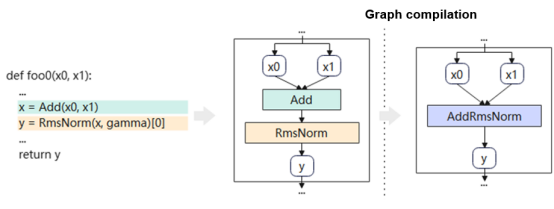 - Operator fusion: Based on the computational graph, operators are fused through automatic pattern matching. Multiple small operators are fused into a single large-granularity operator in the entire graph. Large operators reduce the overhead of host delivery and greatly shorten the compute latency of the device.