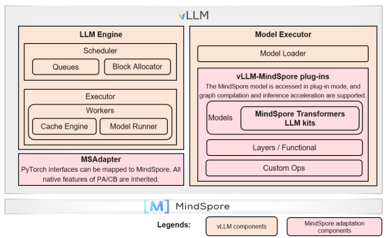 MindSpore 2.6 develops the vllm-mindspore independent plug-in to integrate the LLM inference capability into the vLLM ecosystem. For the vLLM service and scheduling components, the PyTorch interfaces are mapped to the MindSpore capability to fully support core features such as vLLM Continual Batching and PagedAttention. The model, network layer, and custom operator components of the vLLM backend are replaced with the MindSpore-incubated, frontend-based parallel LLM inference module, inheriting the high-performance inference capability of Ascend and MindSpore.