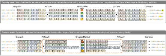 Based on the dynamic shape capability of static graphs and automatic redistribution capability of sharding, Morph custom parallelism is added in MindSpore 2.6, allowing users to control the insertion of communication operators in frontend scripts, greatly improving the usability and flexibility of static graph parallelism. In addition, MindSpore MoE uses Morph to encapsulate expert parallelism of highly dynamic and unaligned shapes based on the capacity mode, and embeds the entire network based on automatic redistribution, implementing Dropless MoE training in static graphs. In addition, the E2E performance is improved through optimization methods such as heterogeneous cache, fused operators, and backward communication overlapping.