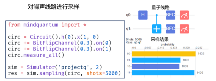 在当前NISQ阶段,真实量子比特的噪声还比较大,为了更准确的模拟真实的量子系统演化,在最新版本中,我们引入了噪声模拟功能,只用在量子线路中引入不同的噪声信道就能完成含噪量子模拟,从而使自己的模型更接近与真实情形,这些噪声信道包含泡利信道、比特翻转信道、相位反转信道等。