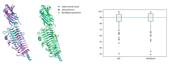 联合工作依托鹏城云脑II 昇腾AI集群进行,TM-score达87分(国际权威评测数据集CASP14),截止22年4月21日,在CAMEO竞赛中已连续三周取得第一,相关训练代码已在昇思MindSpore社区开源。