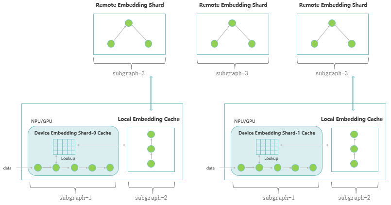 2、分布式Embedding Cache:采用多级Embedding Cache、多级计算流水等设计,实现了大规模特征向量的存储与高性能训练。