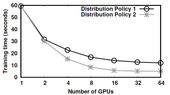 下图中展示了基于Dataflow Fragment的分布式策略,以及对应的训练加速效果,在多机多卡分布式训练场景下可大幅缩短算法的训练时间。