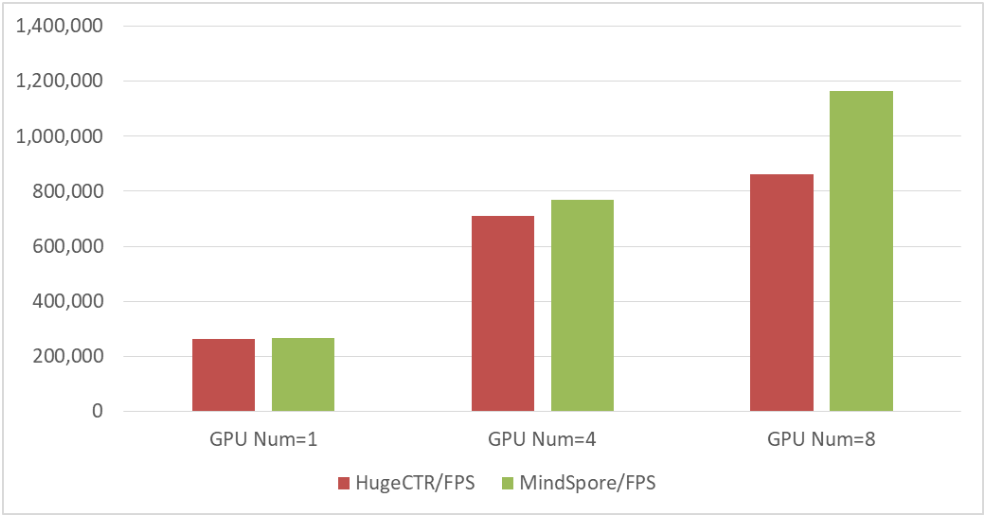 ,如下图所示,单机八卡上昇思MindSpore的吞吐率优于HugeCTR 35%。