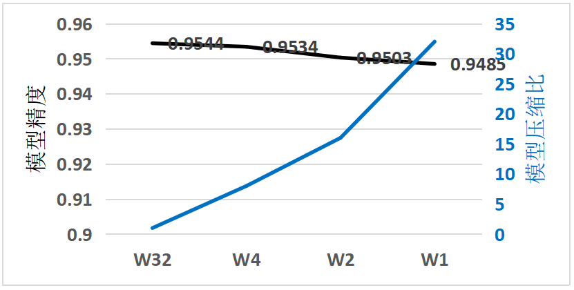 我们对SLB算法做了简单的实验,结果如下图所示,在当前任务中,与全精度模型相比,4bit权重量化后的模型大小缩减为原来的1/8,但top1精度没有损失,1bit权重量化的精度损失在0.6%以内,此时可以获得32倍的模型压缩效果。