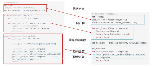 2. 前向计算和反向传播:使用函数式自动微分,更符合数学语义。将前向计算构造成function,然后通过函数变换获得grad function,最后通过执行grad function获得权重对应的梯度。
