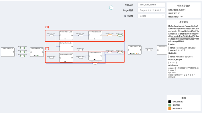 1.9版本中,我们提出了计算-通信二部图方案。计算图中所有的通信算子被抽出至画布顶层。计算图中同时展示了并行策略信息。用户能够清晰地观察并行策略相关算子及计算图的执行序,从而确认通信算子存在的合理性。如下图所示,清晰地展示了使用K级集群并行训练的盘古模型,其中绿色底色代表重排布算子,不同分支的计算-通信节点展现了相应的并行策略。