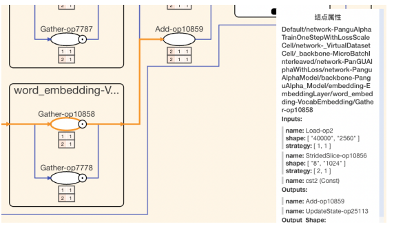 如下图所示,展开命名空间结点,结合策略矩阵,我们可以看到具体算子的切分策略。结合结点属性面板,我们发现Load-op2输入的张量(参数)没有做切分,StridedSlice-op10856输入的张量(数据)第一维切分了两份。盘古模型混合并行解析一文中指出,在词表范围较大时,建议对word_embedding使用模型并行策略,即切分参数。当前训练切分了数据,若改为模型并行,可提升训练效率。