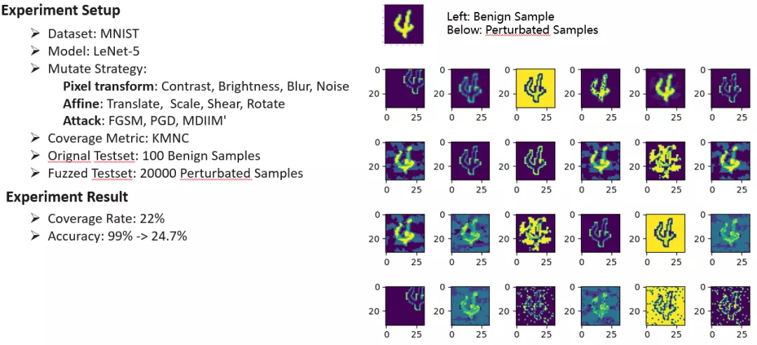 测试过程中,工具的Fuzzer Moduler(Fuzz模块)可以对数据集进行增强,如色差、翻转、模糊等,自动化产生测试样例,如下图右侧。在结果输出方面,用户可以看到模糊测试结果,评价了图像的覆盖率指标以及精度下降。下图左侧可以看出在模型出现扰动的情况下,模型精度(Accuracy)下降程度以及神经元激活程度(Coverage Rate)。